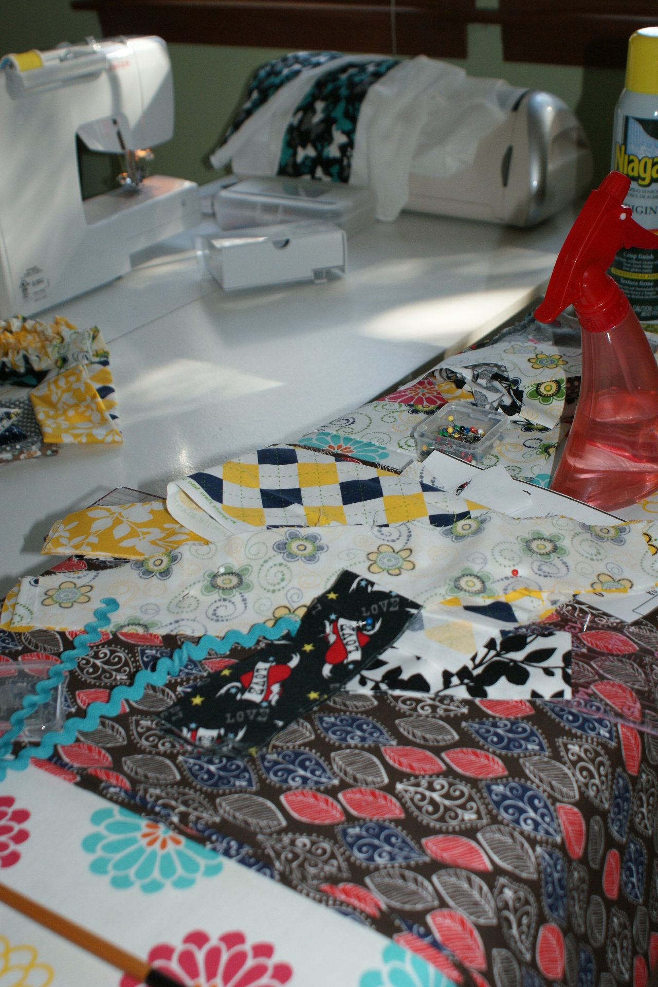 The room is a funny, pale apple green color which causes everything in the room to look dull. It’s horrible for photography, too. This winter I’d like to paint it something a bit more fresh and cheerful. Like many of you, I keep my ironing board open and full of fabric!